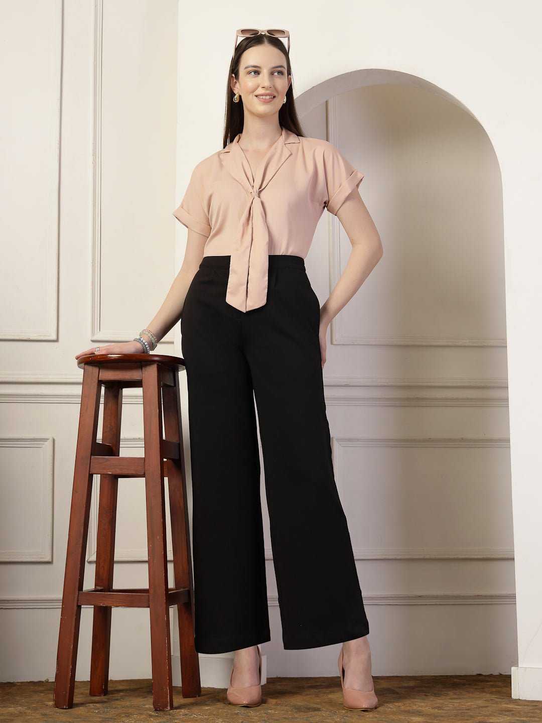 Top featuring a sophisticated lapel collar, exuding timeless elegance with a modern twist, this versatile piece boasts delicate tie-up detailing, adding a touch of whimsy and charm to your ensemble. The extended sleeves of this top offer a contemporary silhouette, effortlessly merging comfort with style.